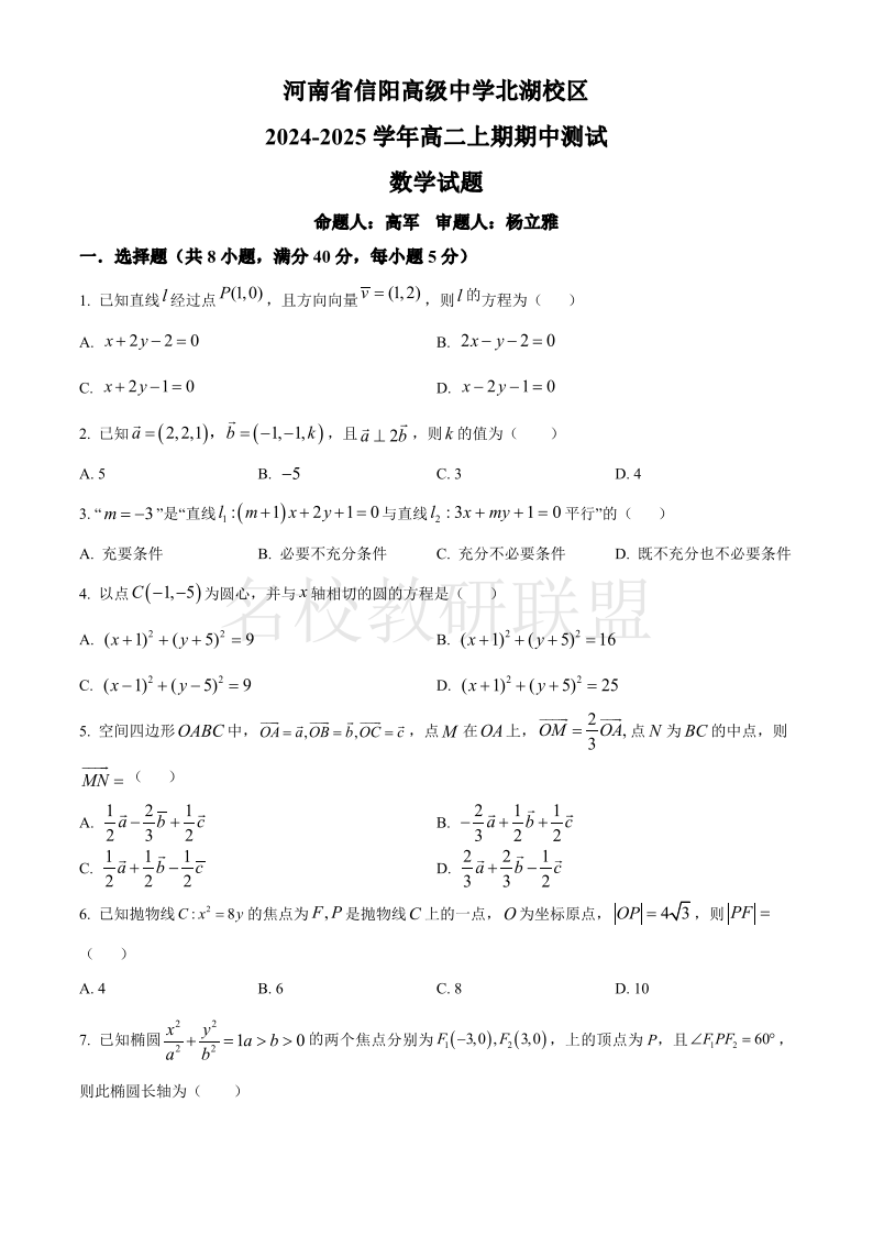 河南省信阳高级中学北湖校区2024-2025学年高二上学期期中考试 数学