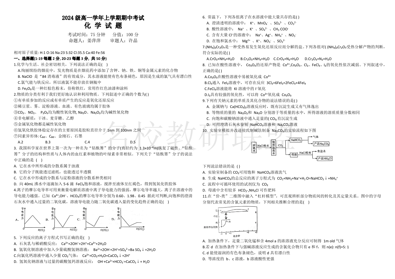 黑龙江省牡丹江市第一高级中学2024-2025学年高一上学期11月期中考试 化学