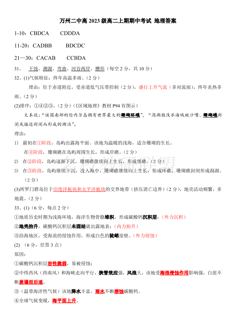 重庆市万州二中2024-2025学年高二上学期期中考试 地理答案