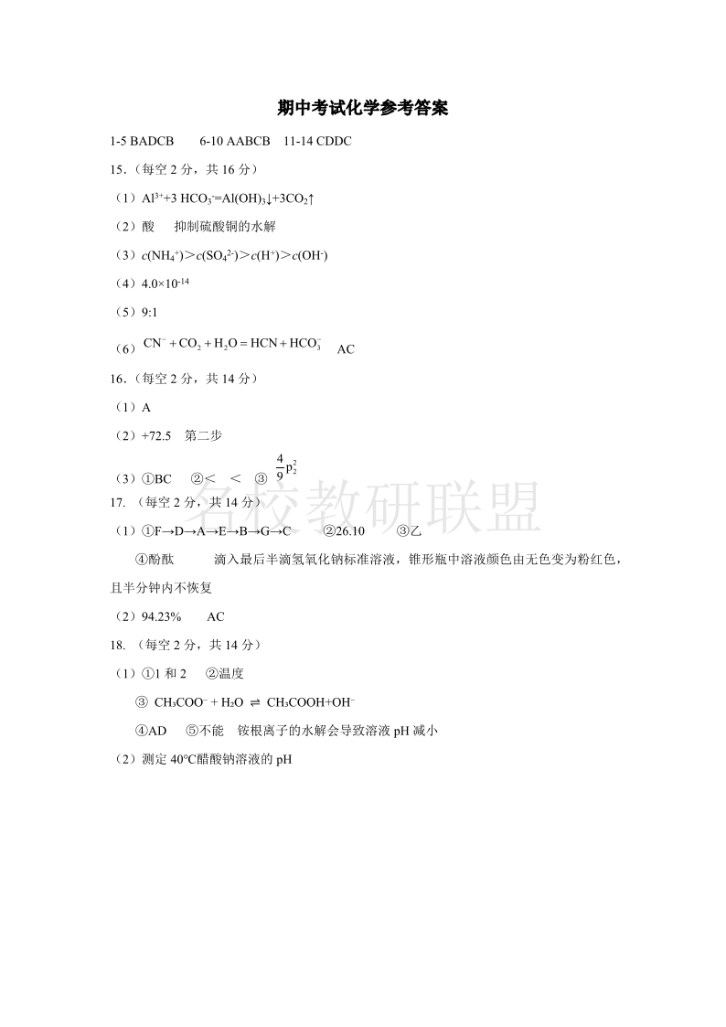 重庆市万州二中2024-2025学年高二上学期期中考试 化学答案