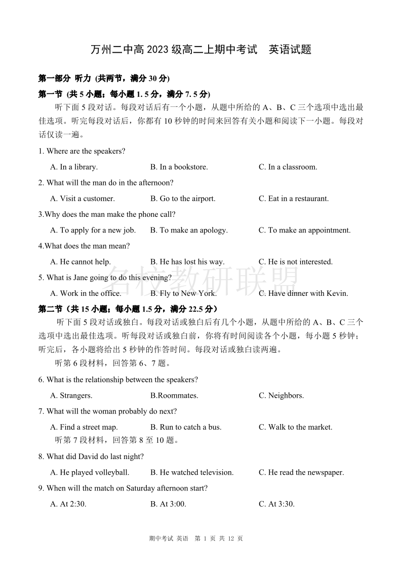 重庆市万州二中2024-2025学年高二上学期期中考试 英语