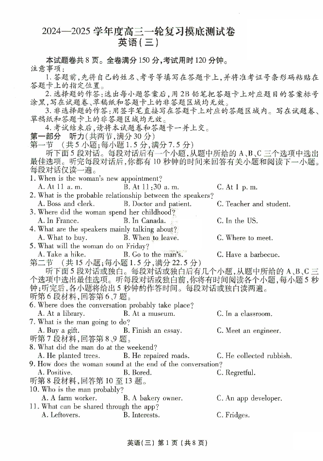 河北省沧州市运东五校2025届高三上学期11月期中考试 英语