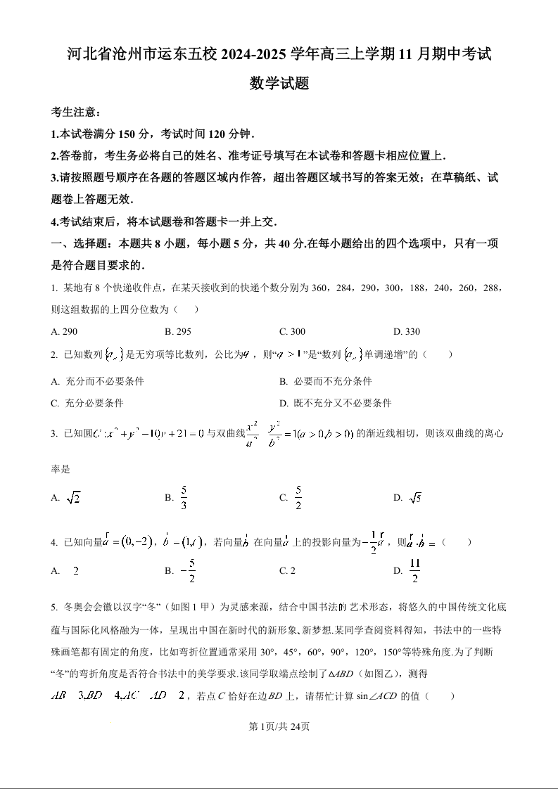 河北省沧州市运东五校2025届高三上学期11月期中考试 数学