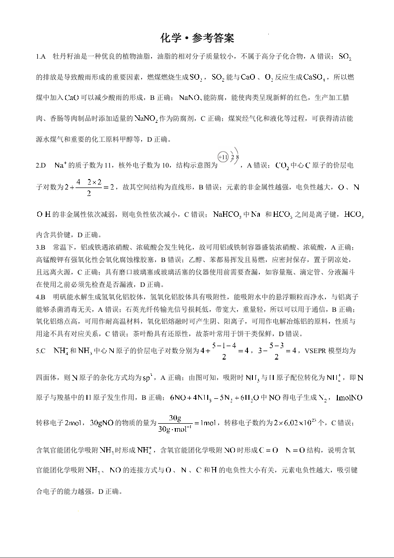 河北省沧州市三校联考2025届高三上学期11月期中考试 化学答案
