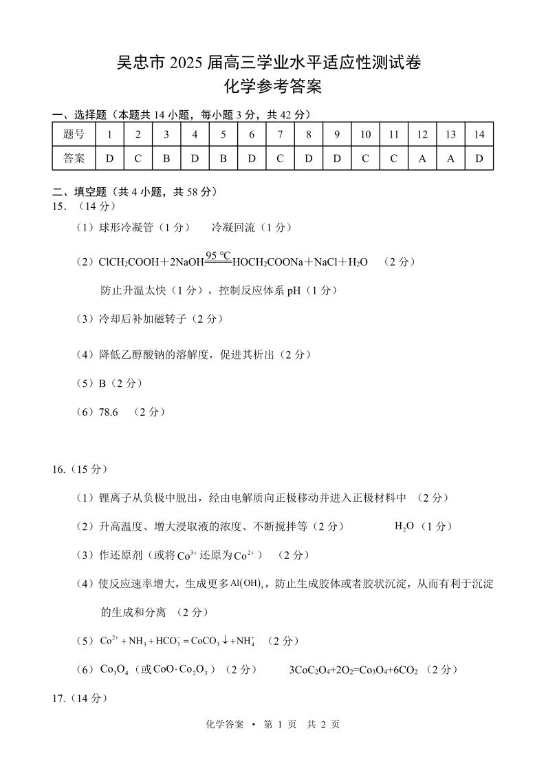 宁夏省吴忠市高三上学期11月学业水平适应性考试 化学参考答案