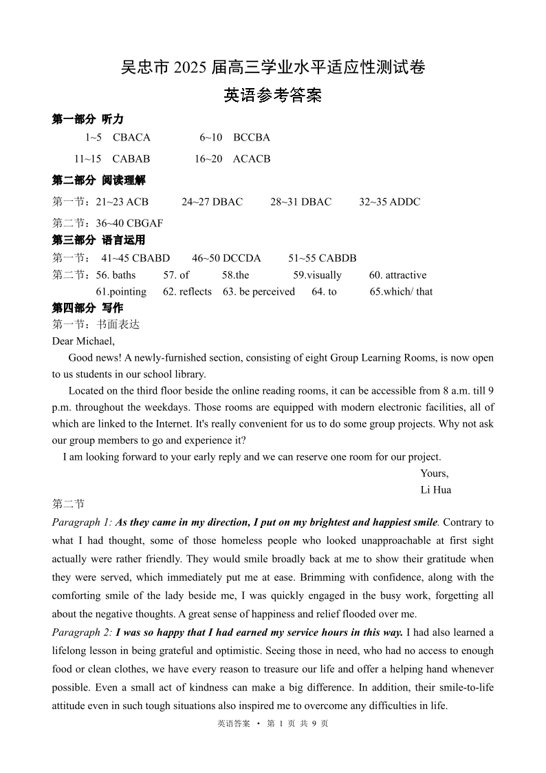 宁夏省吴忠市高三上学期11月学业水平适应性考试 英语参考答案