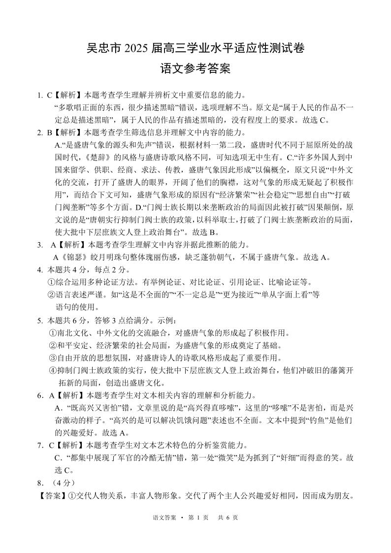 宁夏省吴忠市高三上学期11月学业水平适应性考试 语文参考答案