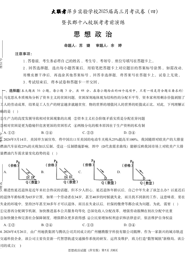 江西省萍乡实验学校2025届高三月考试卷 (四)暨长郡十八校联考模拟考试 政治