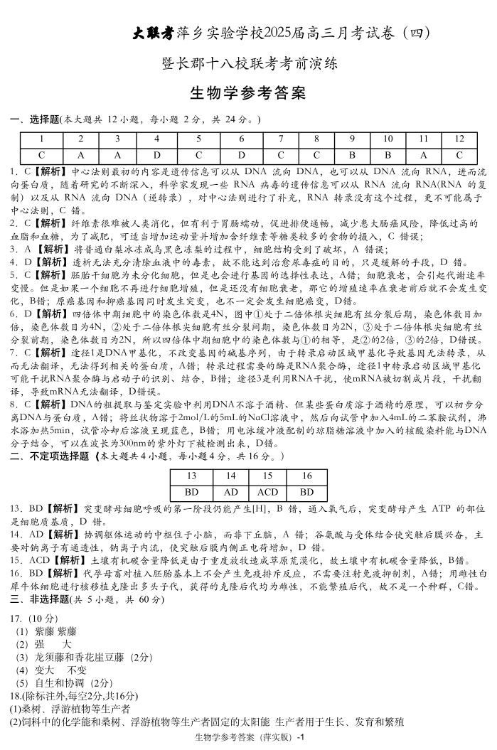 江西省萍乡实验学校2025届高三月考试卷 (四)暨长郡十八校联考模拟考试 生物答案