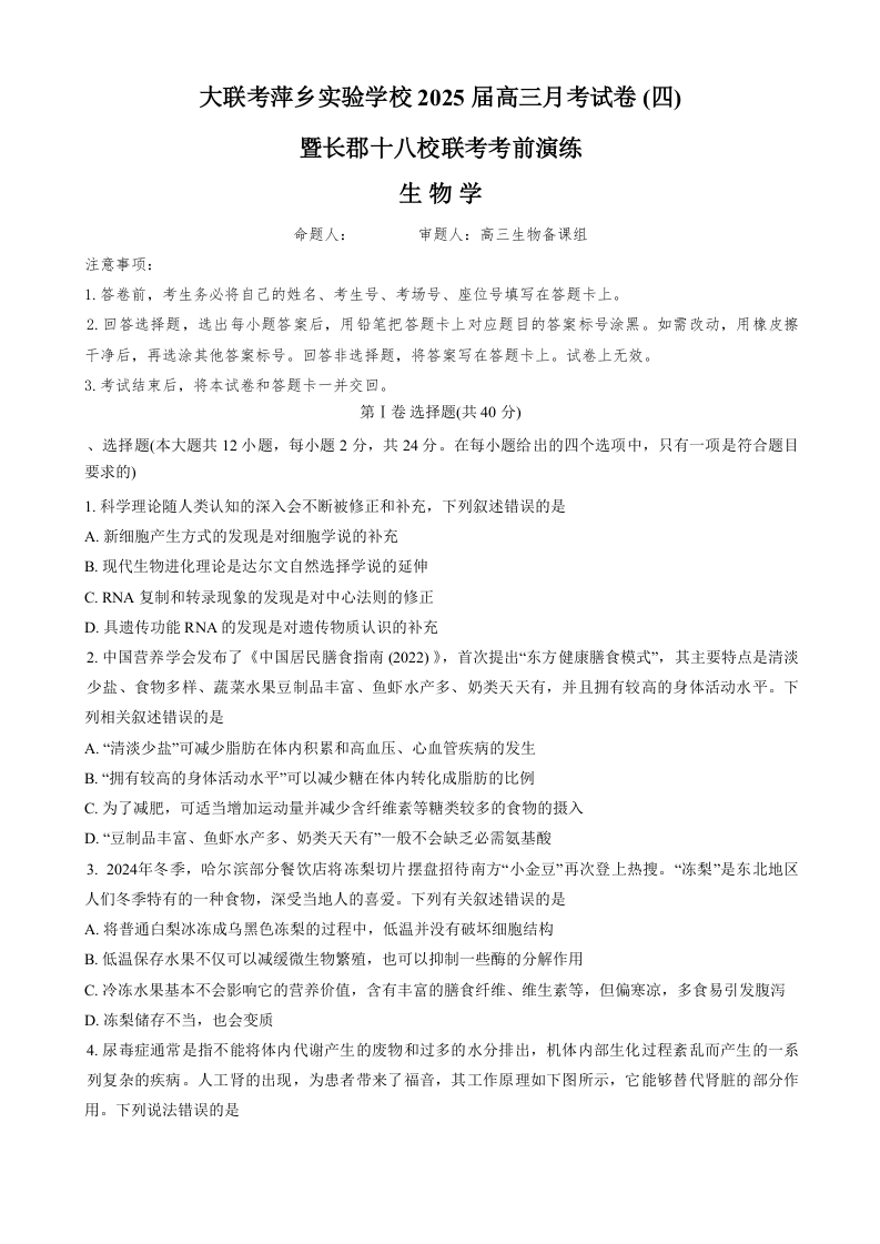 江西省萍乡实验学校2025届高三月考试卷 (四)暨长郡十八校联考模拟考试 生物