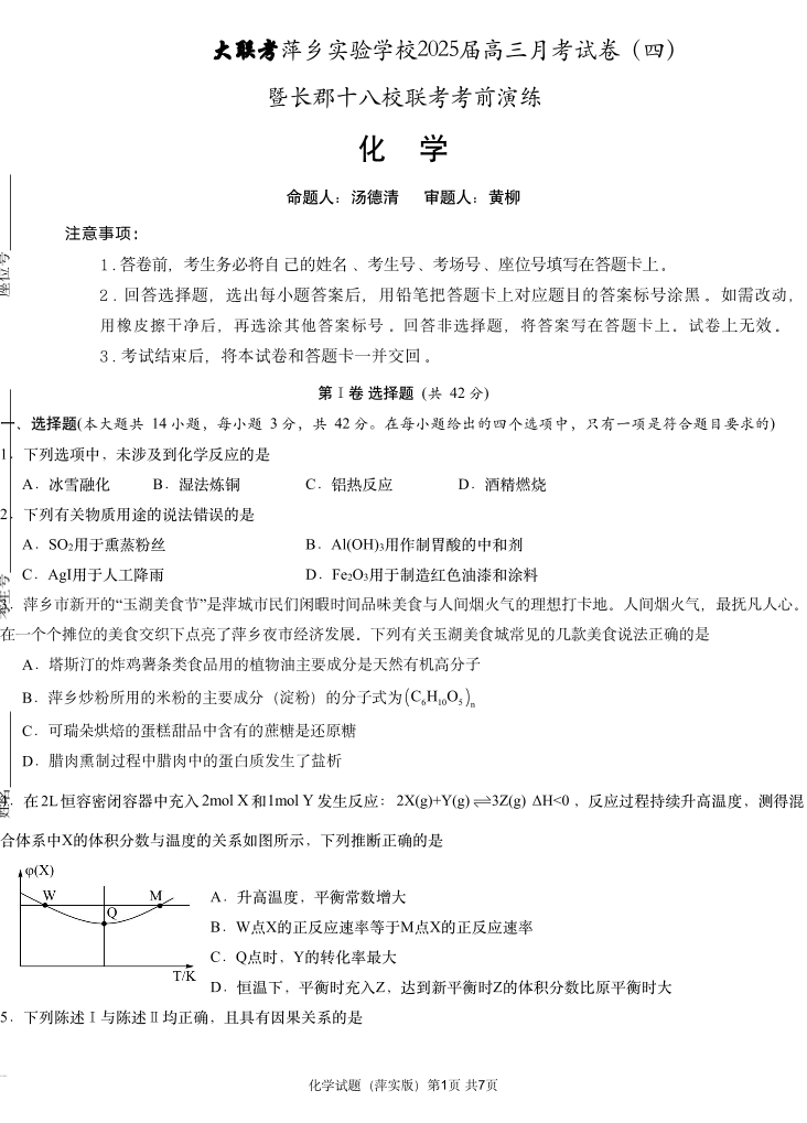 江西省萍乡实验学校2025届高三月考试卷 (四)暨长郡十八校联考模拟考试 化学