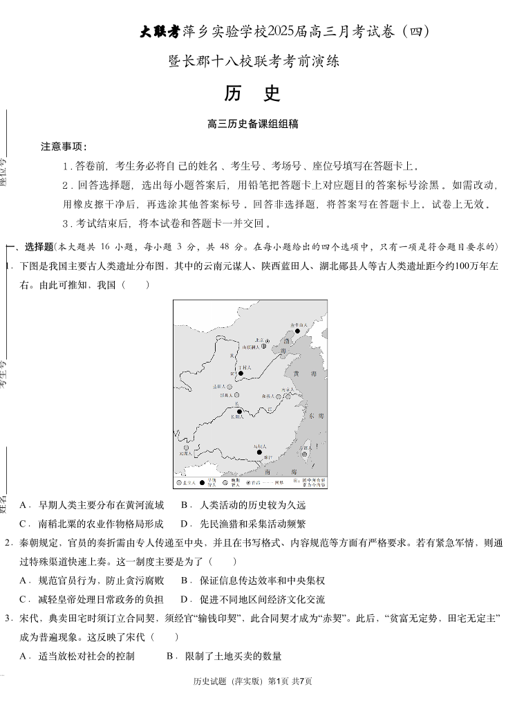 江西省萍乡实验学校2025届高三月考试卷 (四)暨长郡十八校联考模拟考试 历史