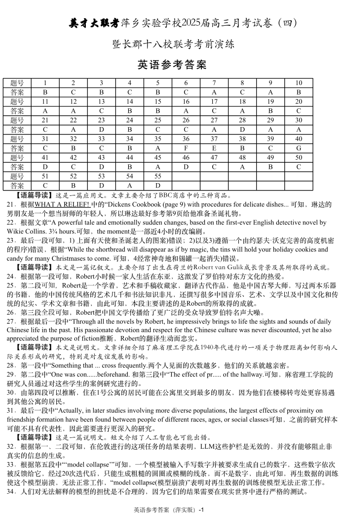 江西省萍乡实验学校2025届高三月考试卷 (四)暨长郡十八校联考模拟考试 英语答案