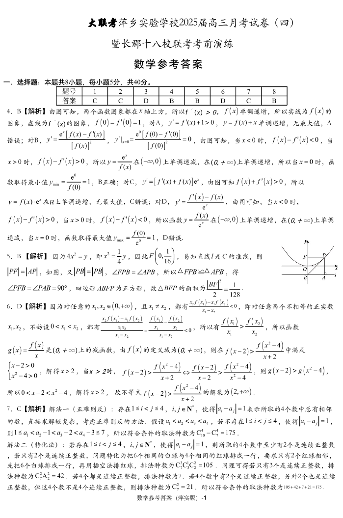 江西省萍乡实验学校2025届高三月考试卷 (四)暨长郡十八校联考模拟考试 数学答案