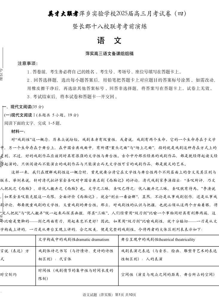 江西省萍乡实验学校2025届高三月考试卷 (四)暨长郡十八校联考模拟考试 语文