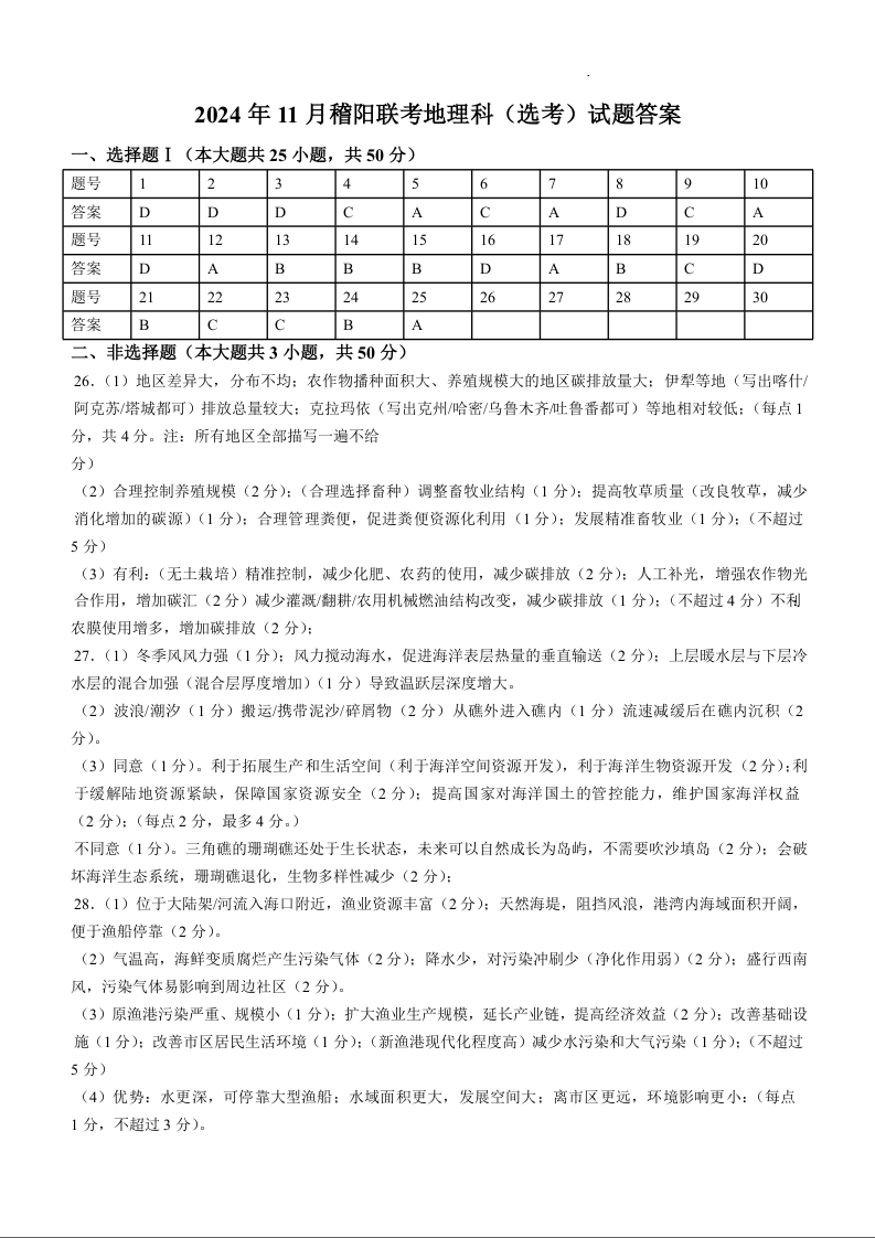 浙江省稽阳联谊学校2024-2025学年高三上学期11月月考 地理答案