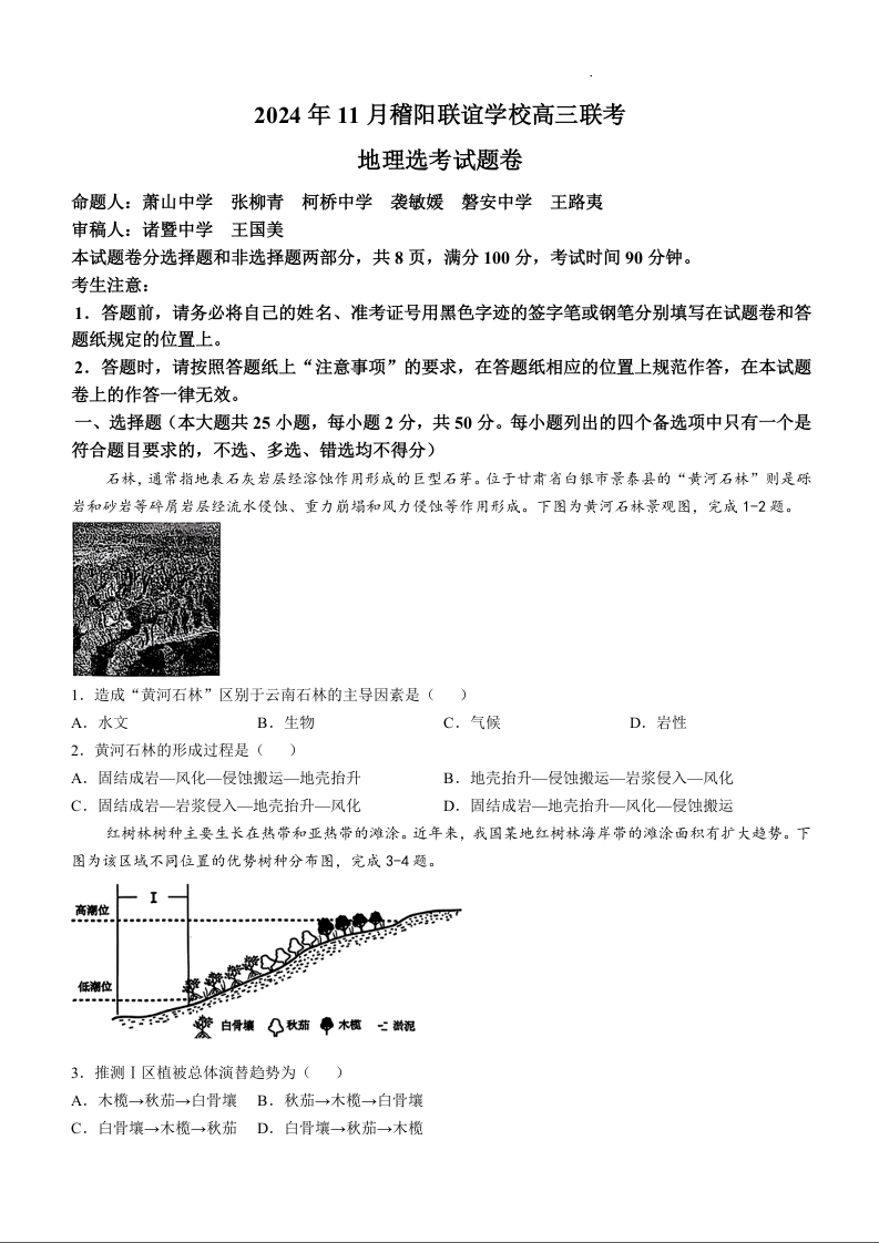 浙江省稽阳联谊学校2024-2025学年高三上学期11月月考 地理