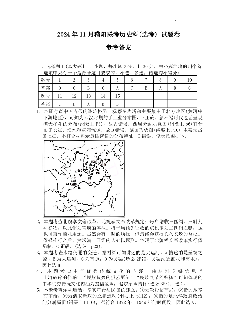 浙江省稽阳联谊学校2024-2025学年高三上学期11月月考 历史答案