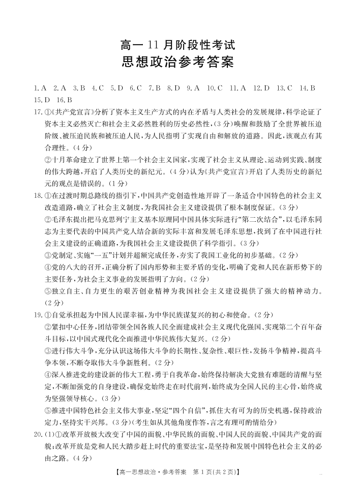 广西名校联盟2024-2025学年高一上学期11月期中阶段性考试 政治答案
