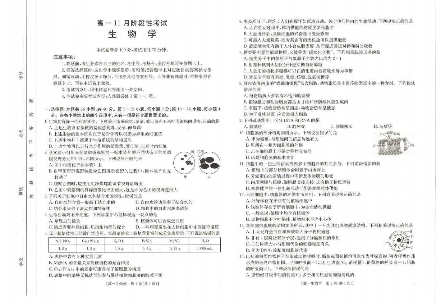 广西名校联盟2024-2025学年高一上学期11月期中阶段性考试 生物