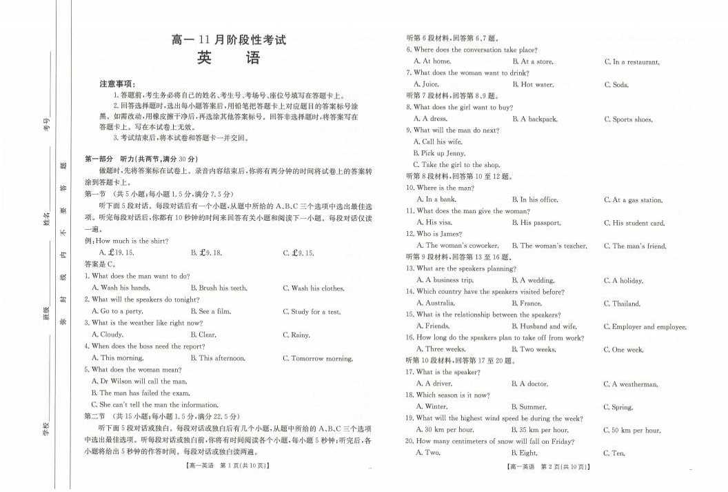 广西名校联盟2024-2025学年高一上学期11月期中阶段性考试 英语