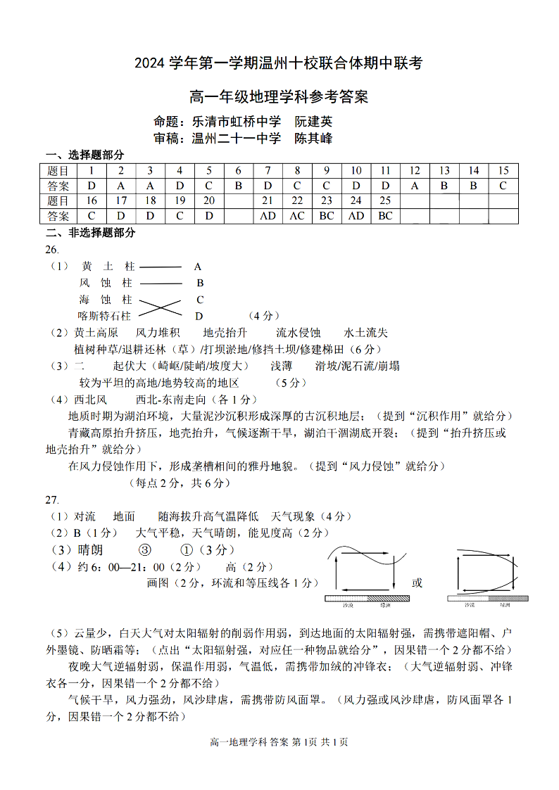 温州十校联合体2024学年高一第一学期期中联考 地理答案