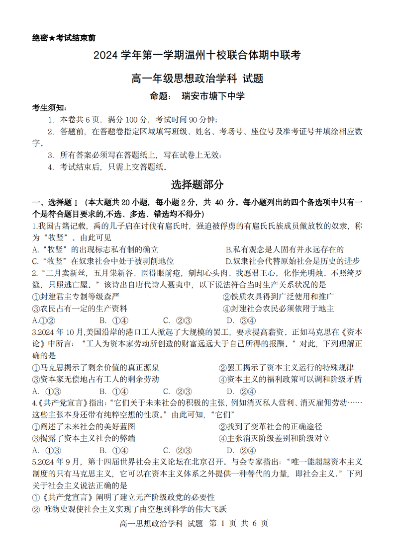 温州十校联合体2024学年高一第一学期期中联考 政治