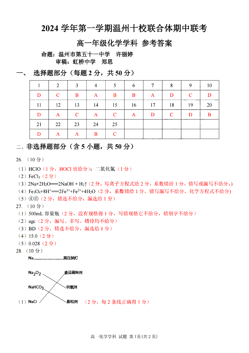 温州十校联合体2024学年高一第一学期期中联考 化学答案