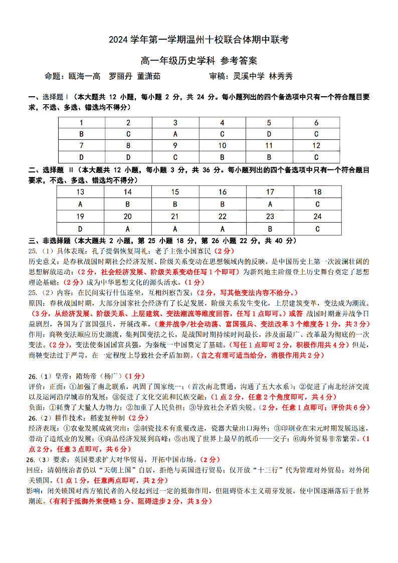 温州十校联合体2024学年高一第一学期期中联考 历史答案