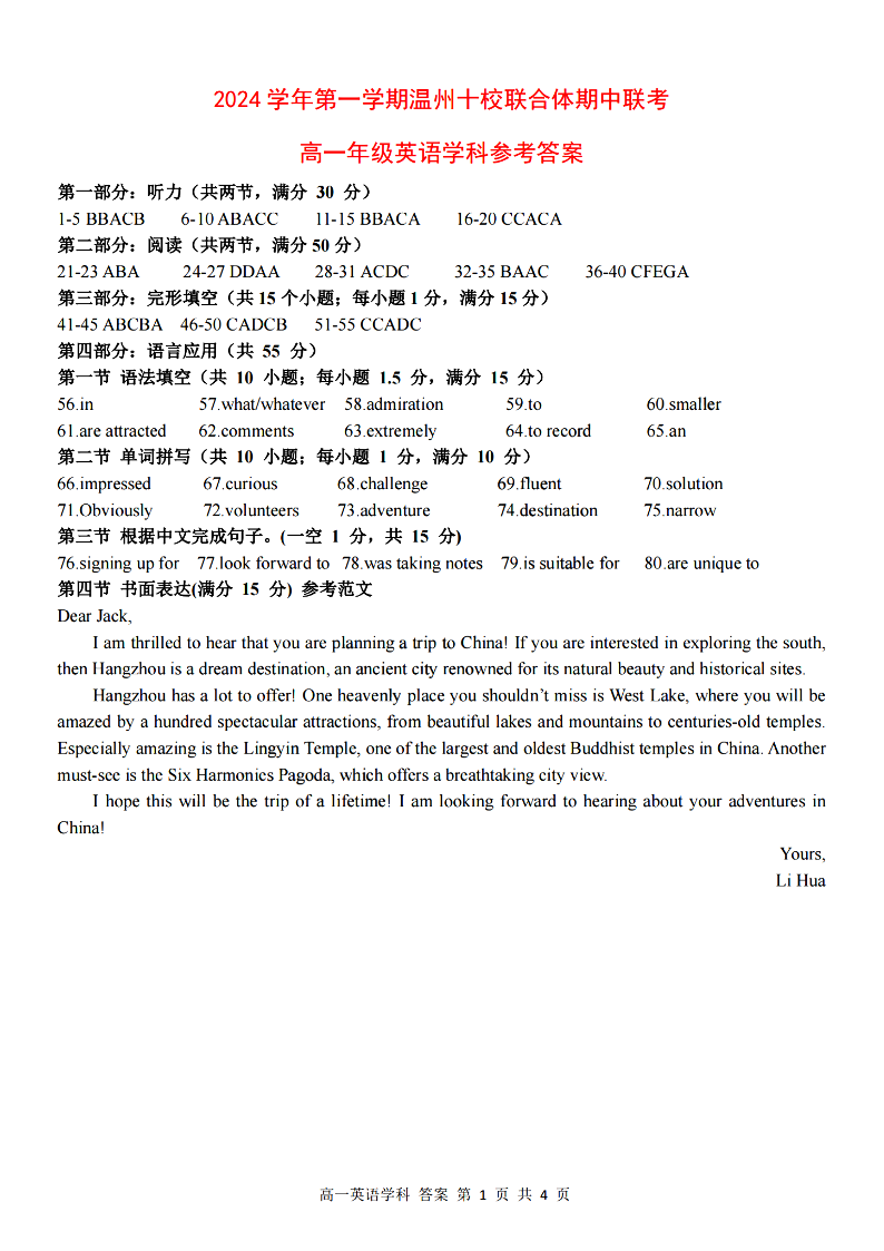 温州十校联合体2024学年高一第一学期期中联考 英语答案