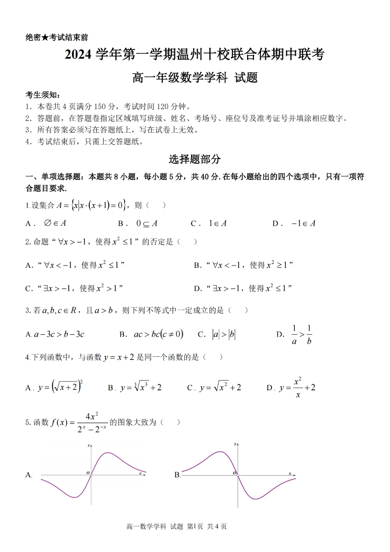 温州十校联合体2024学年高一第一学期期中联考 数学