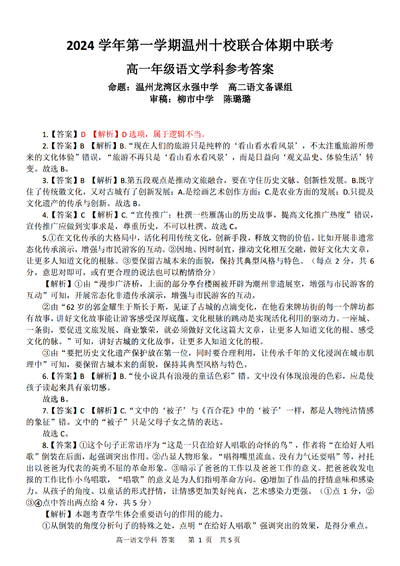 温州十校联合体2024学年高一第一学期期中联考 语文答案