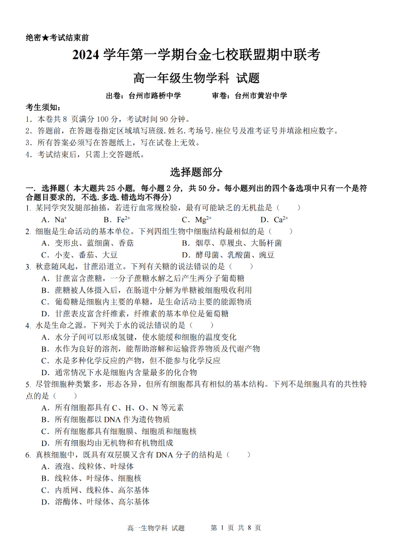 台金七校联盟2024学年高一第一学期期中联考 生物