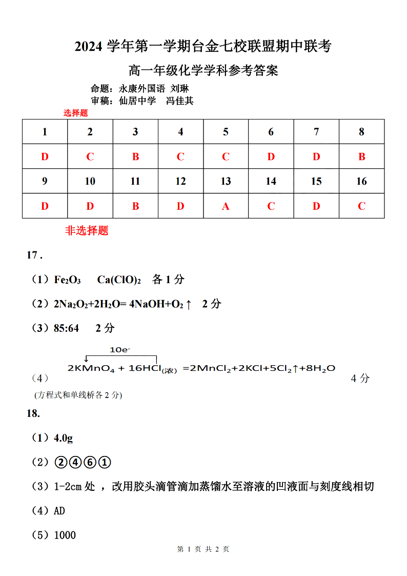 台金七校联盟2024学年高一第一学期期中联考 化学答案