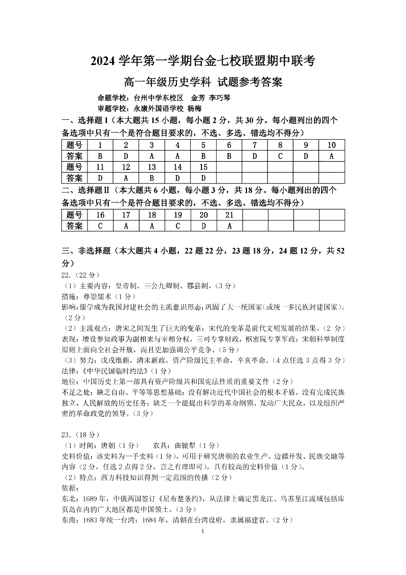 台金七校联盟2024学年高一第一学期期中联考 历史答案
