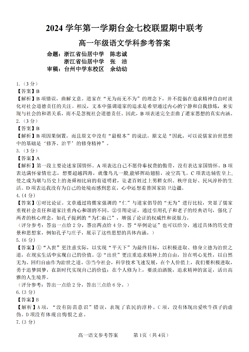 台金七校联盟2024学年高一第一学期期中联考 语文答案