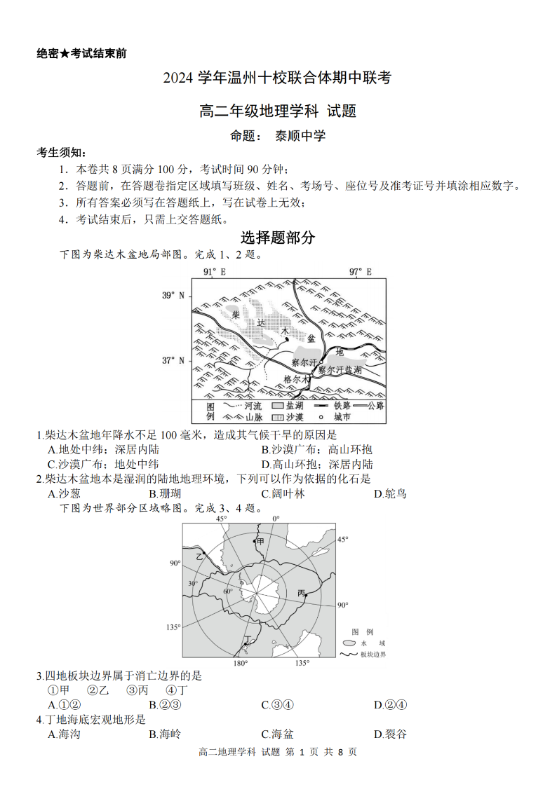 温州十校联合体2024学年高二第一学期期中联考 地理