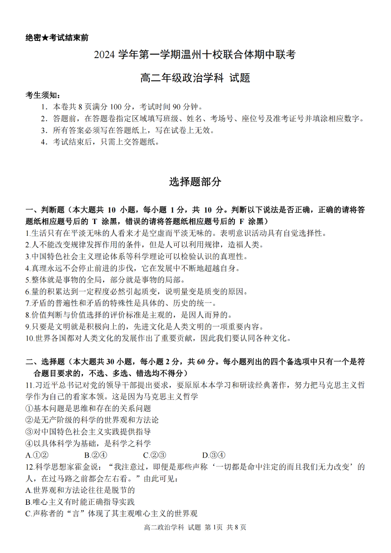 温州十校联合体2024学年高二第一学期期中联考 政治