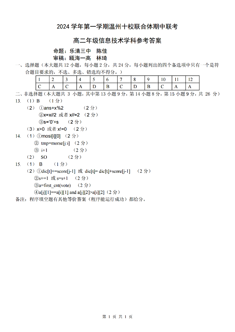 温州十校联合体2024学年高二第一学期期中联考 技术答案
