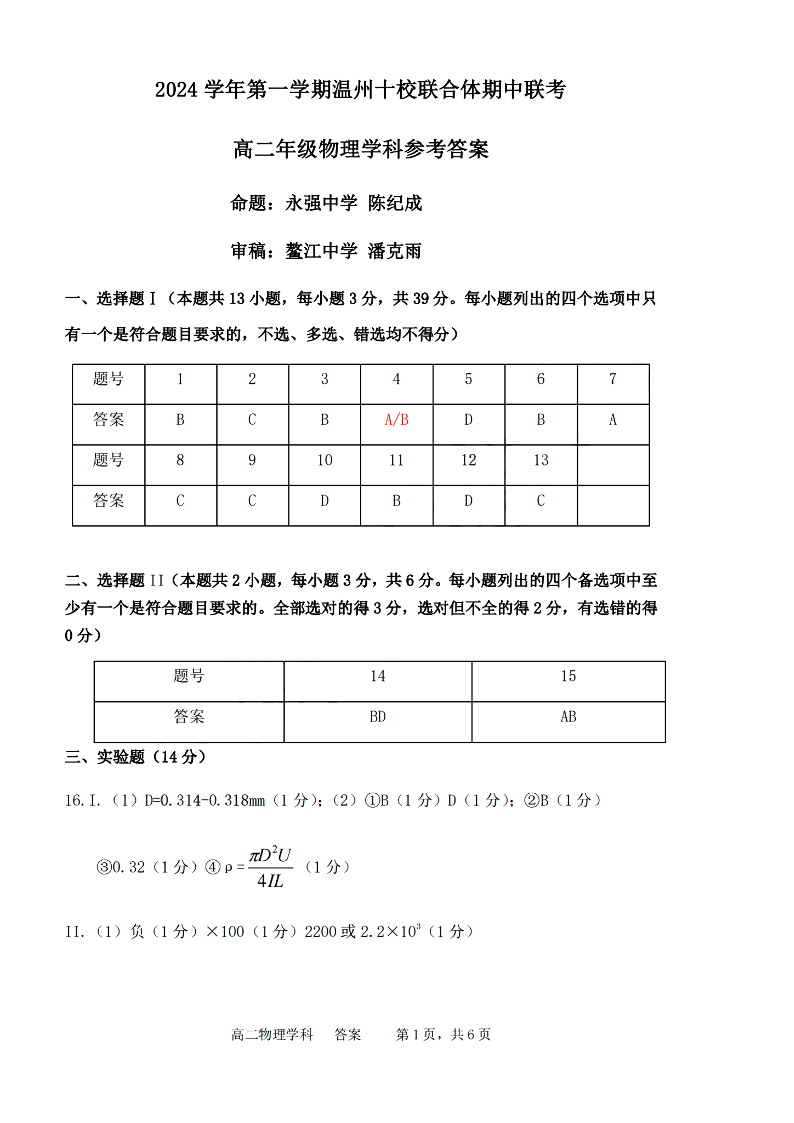 温州十校联合体2024学年高二第一学期期中联考 物理答案