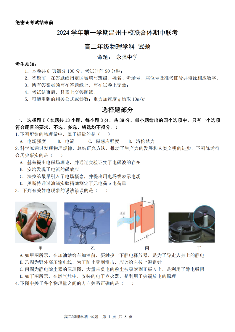 温州十校联合体2024学年高二第一学期期中联考 物理