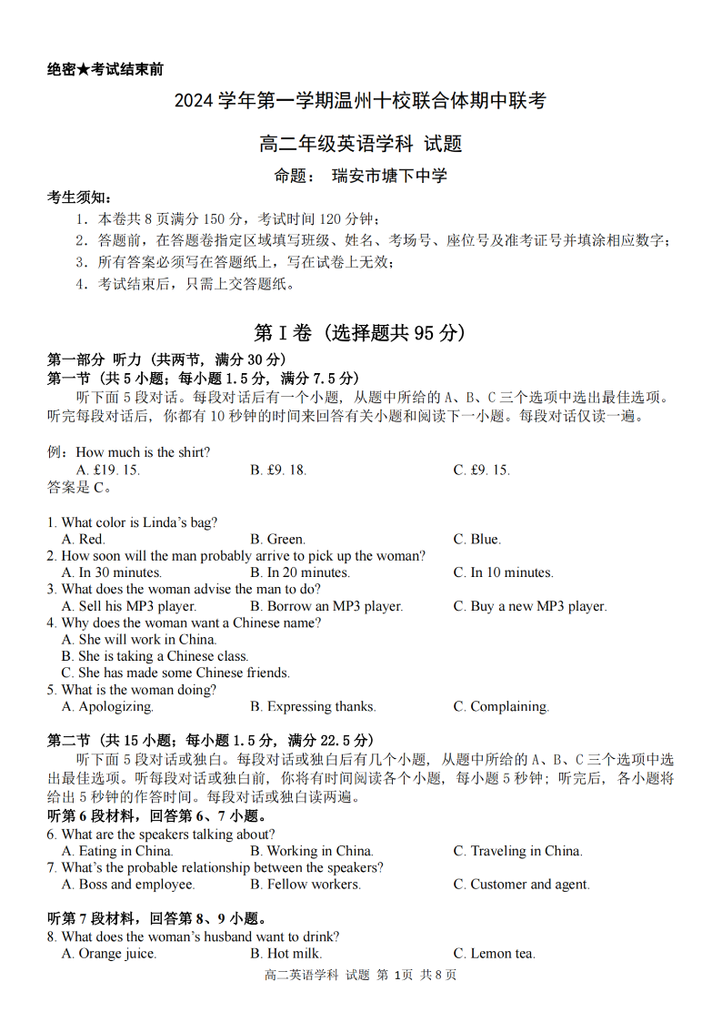 温州十校联合体2024学年高二第一学期期中联考 英语