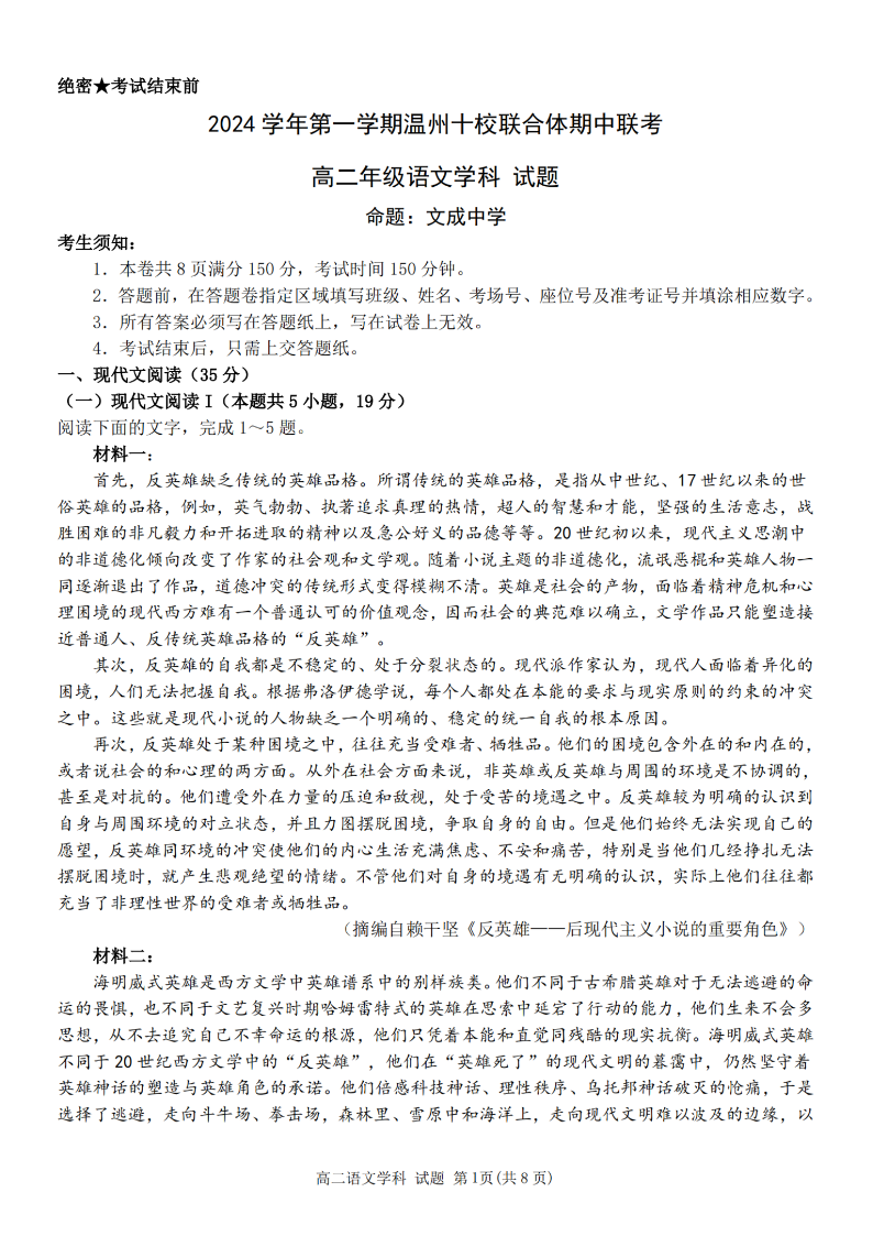 温州十校联合体2024学年高二第一学期期中联考 语文