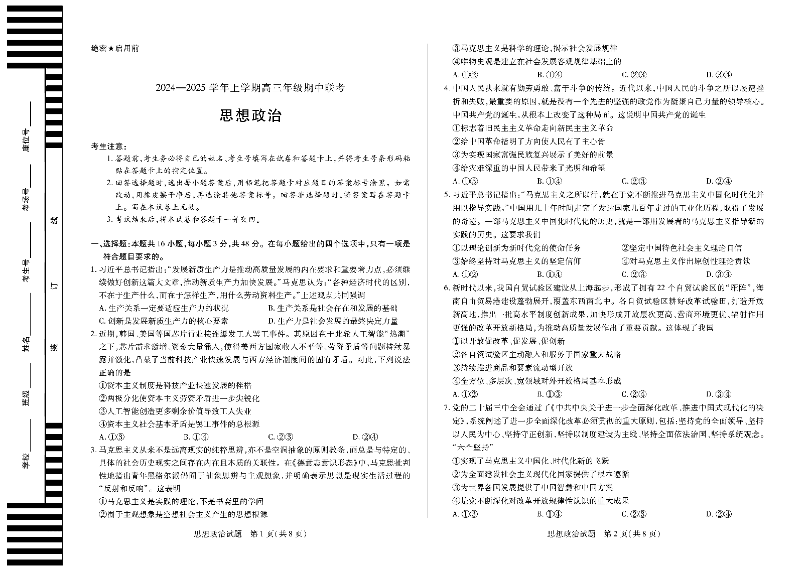 安徽省卓越县中联盟2024-2025学年上学期高三年级期中联考 政治