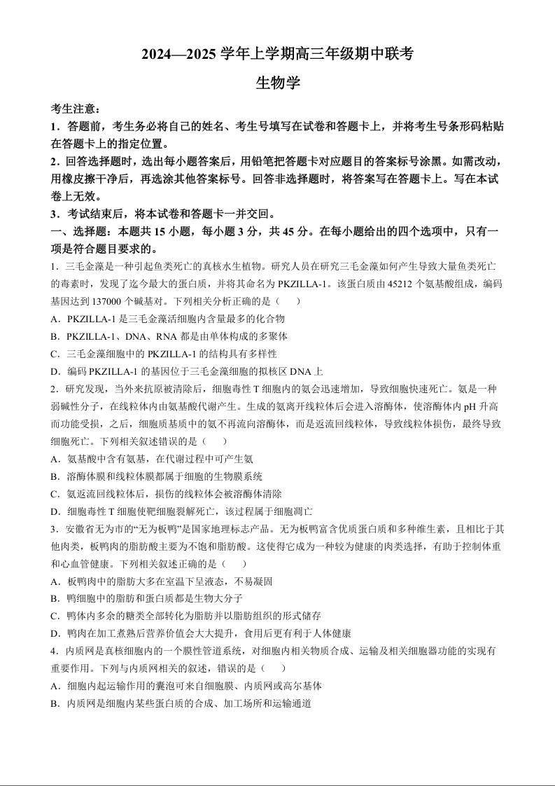 安徽省卓越县中联盟2024-2025学年上学期高三年级期中联考 生物