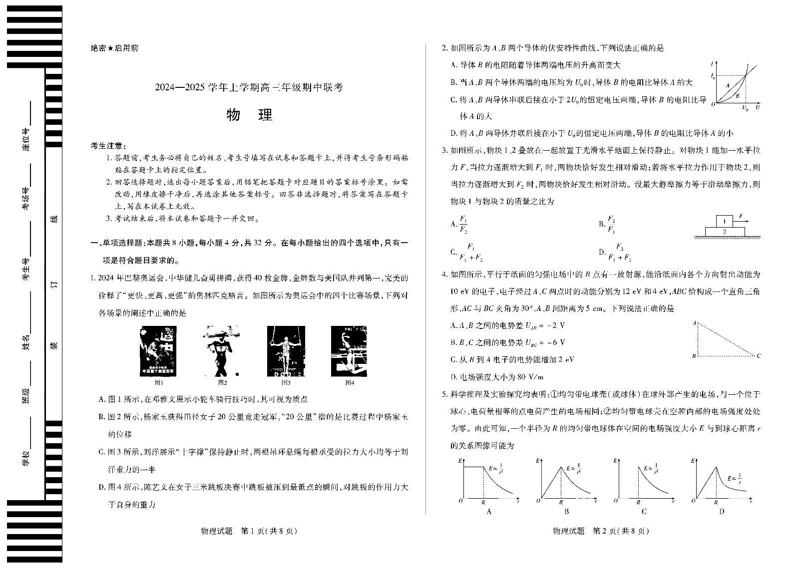 安徽省卓越县中联盟2024-2025学年上学期高三年级期中联考 物理