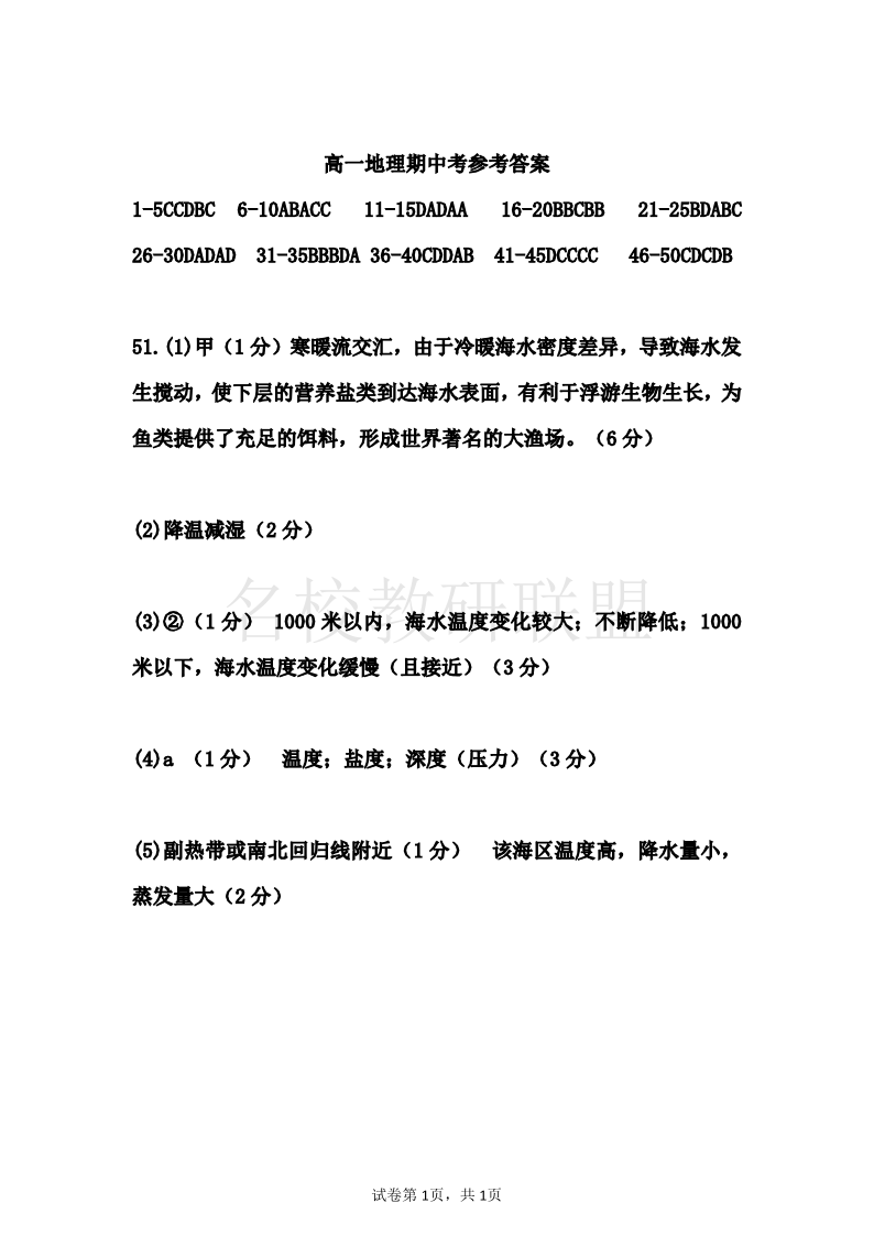 广东实验中学2024-2025 学年(上)高一级期中考试 地理答案