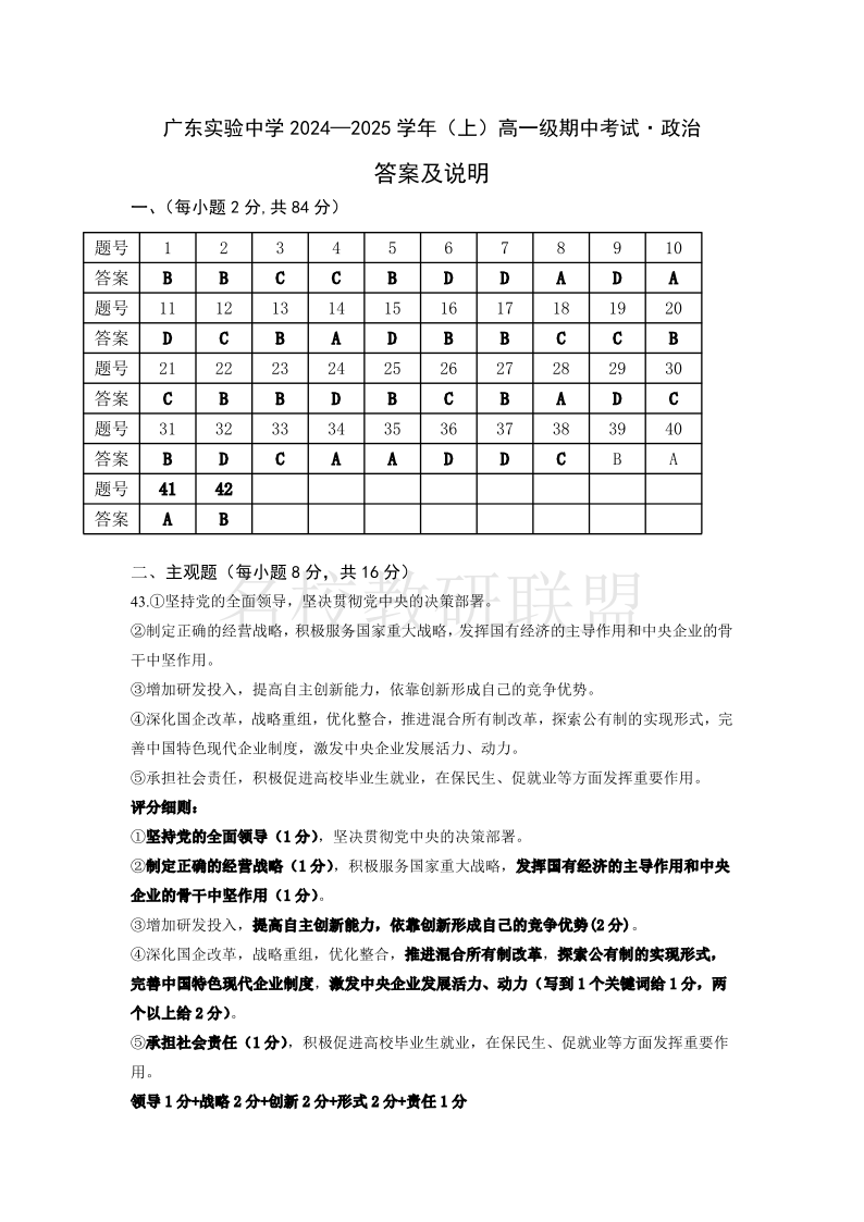 广东实验中学2024-2025 学年(上)高一级期中考试 政治答案