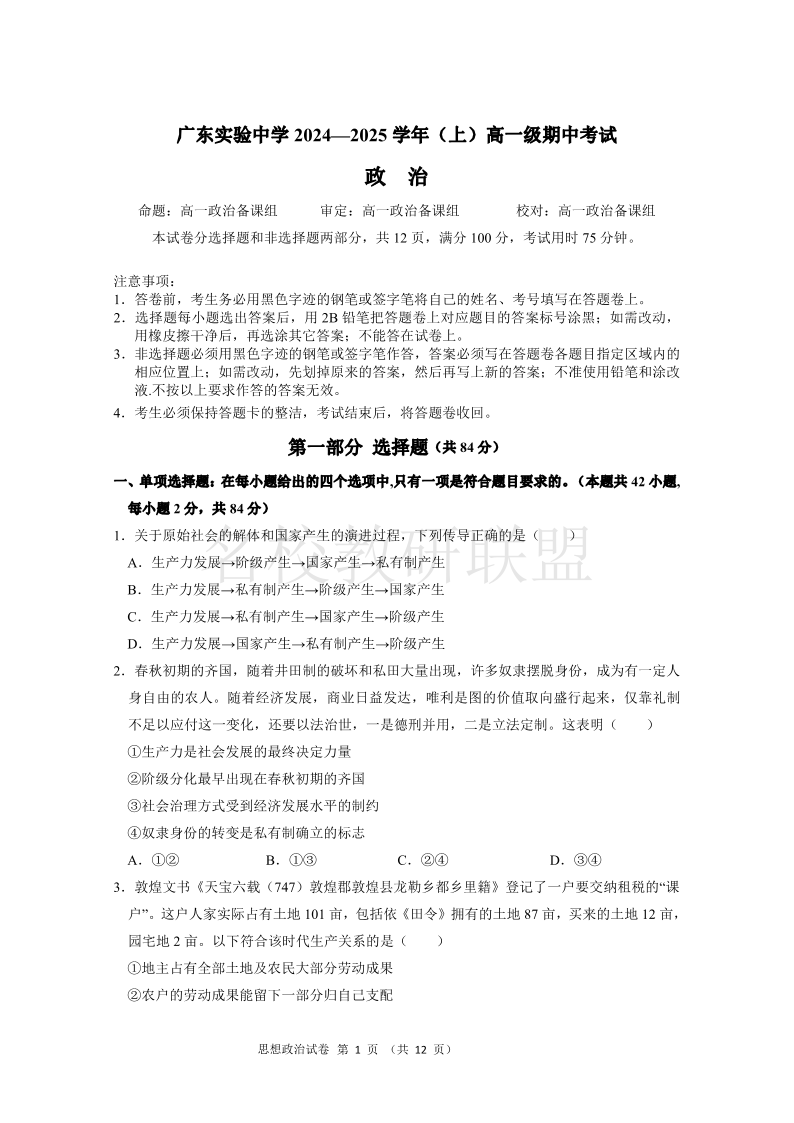 广东实验中学2024-2025 学年(上)高一级期中考试 政治