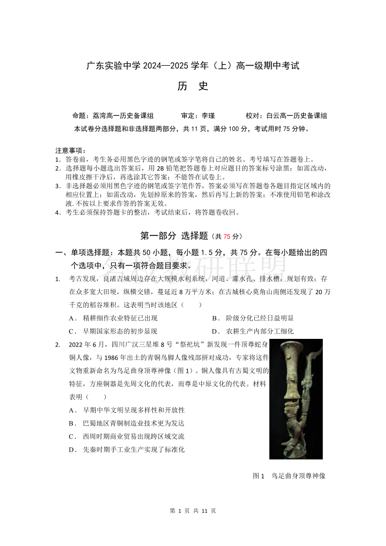 广东实验中学2024-2025 学年(上)高一级期中考试 历史